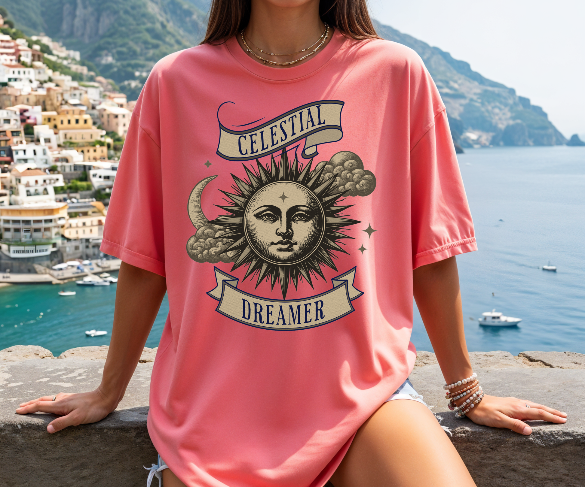A serene sun, crescent moon, and drifting clouds nestle inside an old-school banner reading "Celestial Dreamer," creating quiet, introspective energy perfect for slow evenings, stargazing walks, or layered styling as seasons shift.